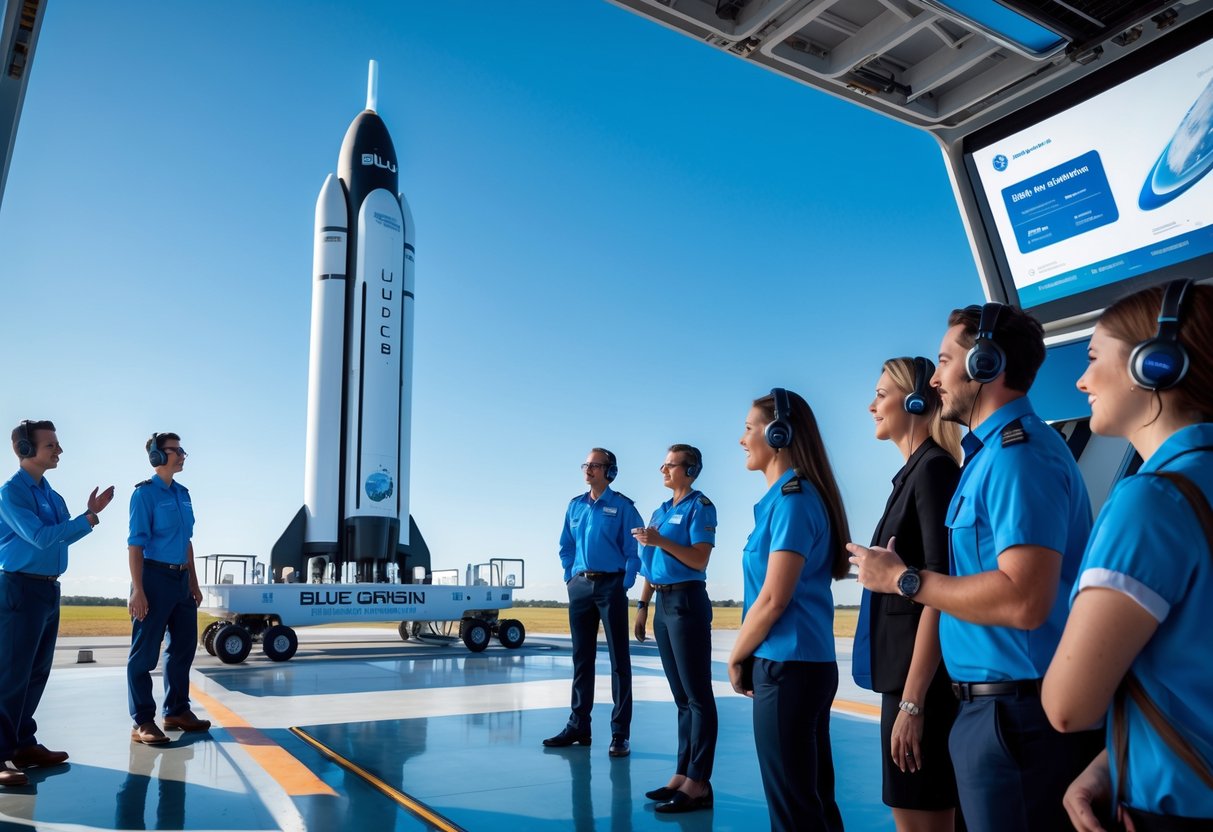 A Blue Origin rocket on a launch pad with engineers preparing for launch and passengers being briefed nearby.