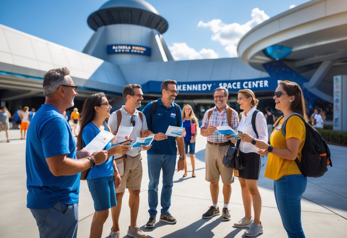 A group of diverse tourists holding admission tickets and tour packages outside the Kennedy Space Center visitor center on a sunny day.