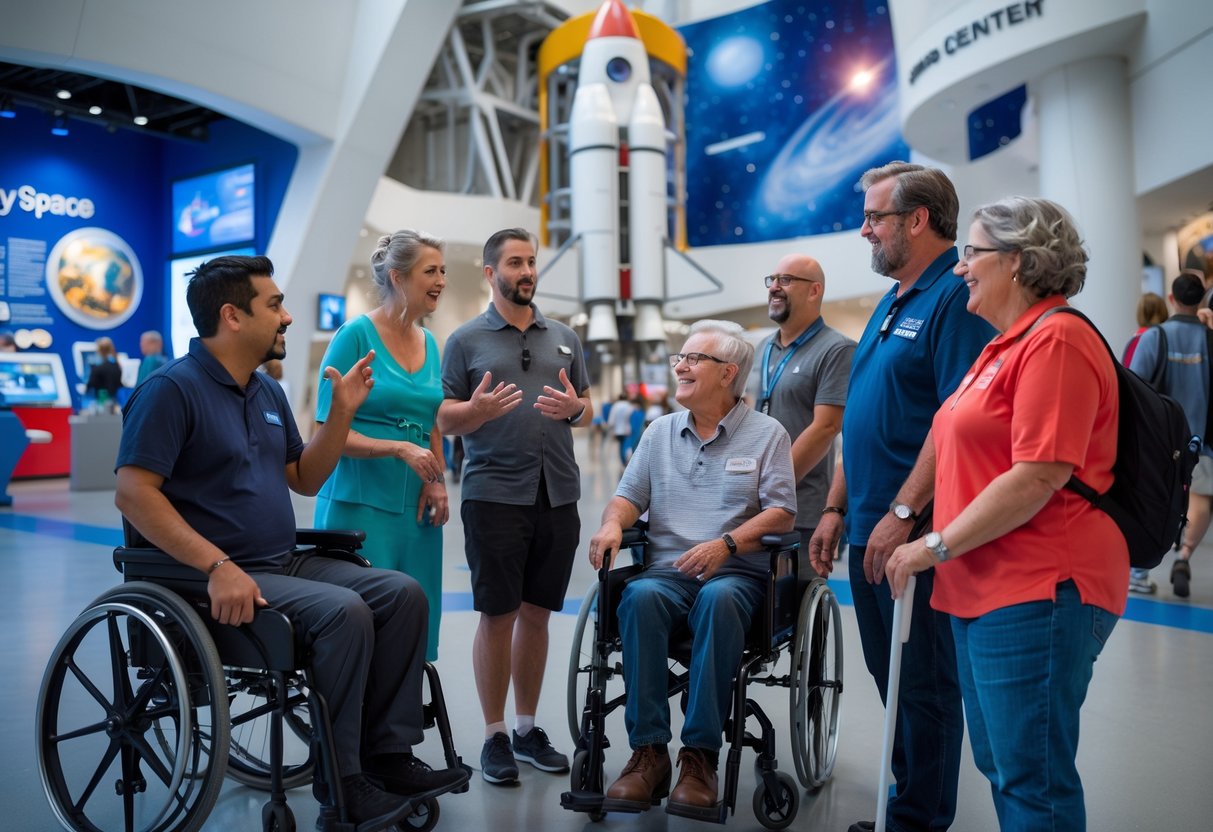 A group of diverse visitors, including a person in a wheelchair, on an accessible guided tour at the Kennedy Space Center near a large rocket exhibit.