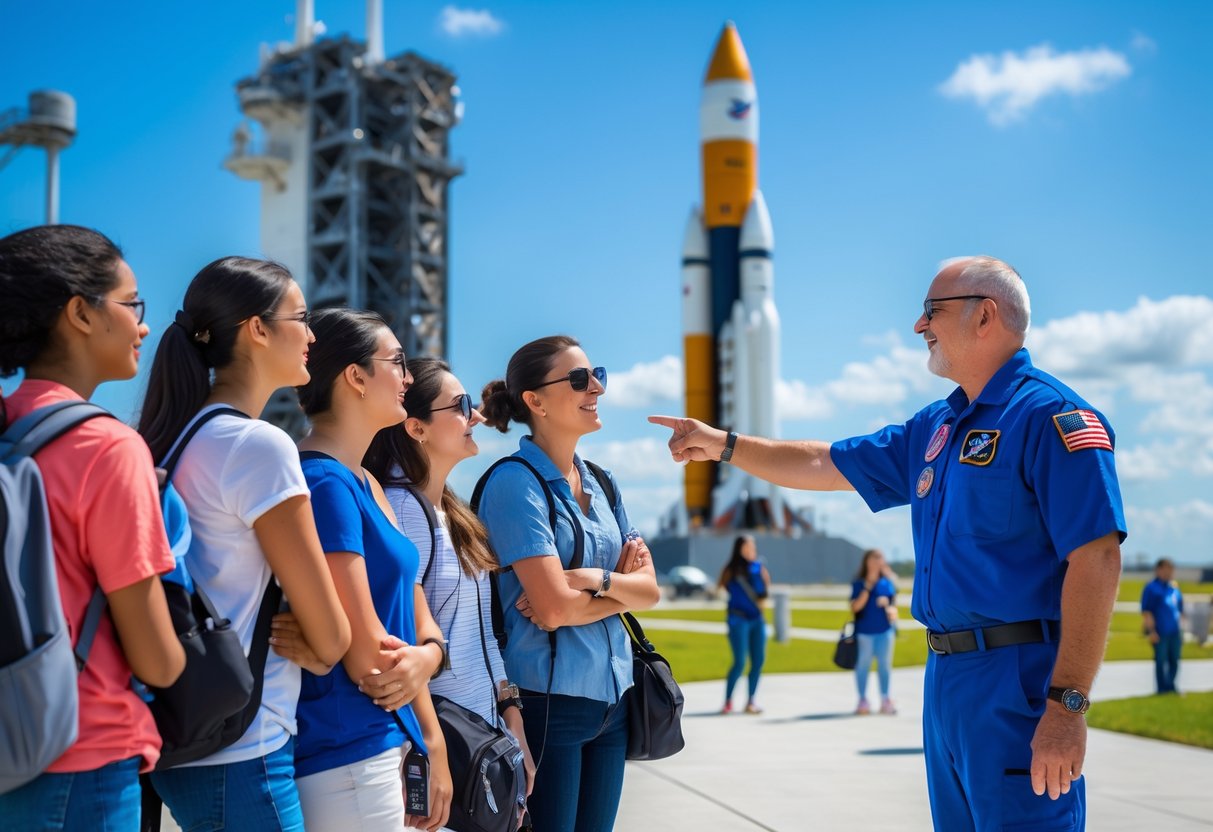 A group of tourists listening to a NASA guide near a large rocket at Kennedy Space Center outdoors.