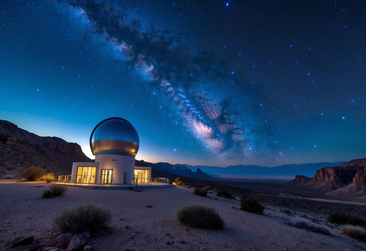 A nighttime desert landscape in Chile with a large astronomical observatory under a star-filled sky and the Milky Way visible above.