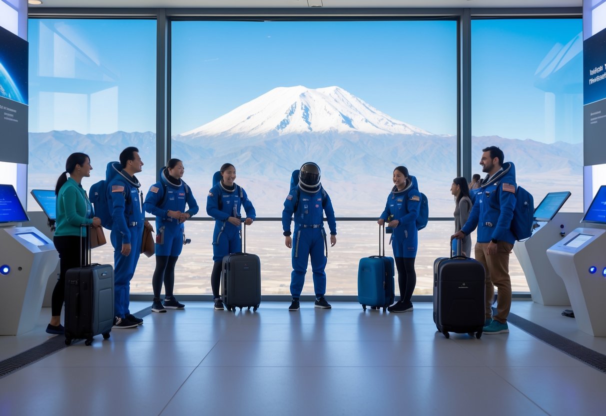 A group of tourists near a modern spacecraft with the Andes mountains in the background, preparing for a space trip in Chile.