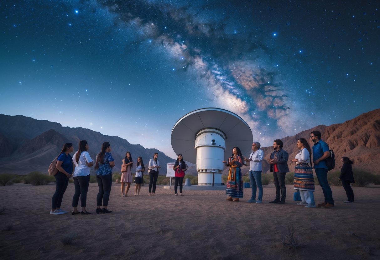 People observing the night sky with telescopes at an observatory in the Atacama Desert, surrounded by mountains and stars.