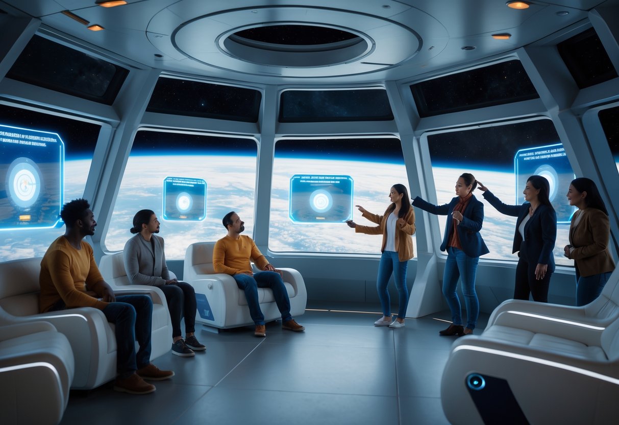 Spacecraft windows with AR displays show flight data, altitude, and mission timelines in real time. Tourists can track their trip around Earth and pick up some orbital mechanics along the way.