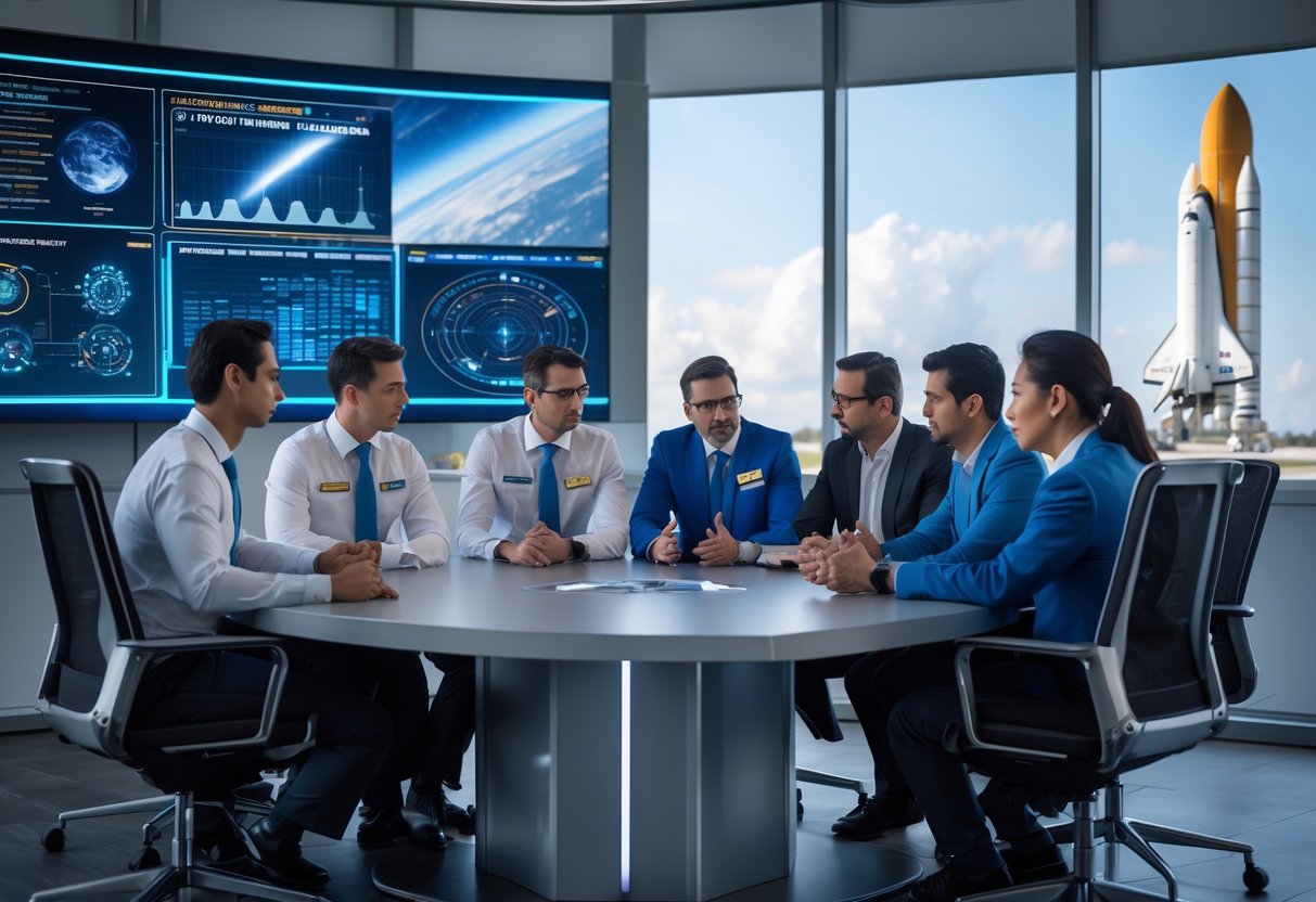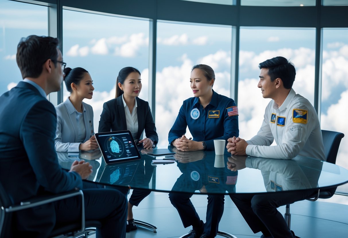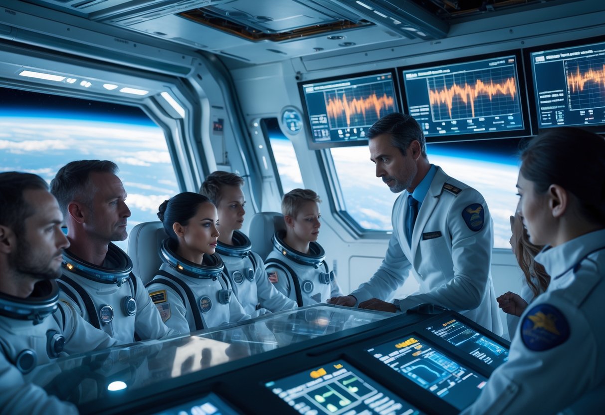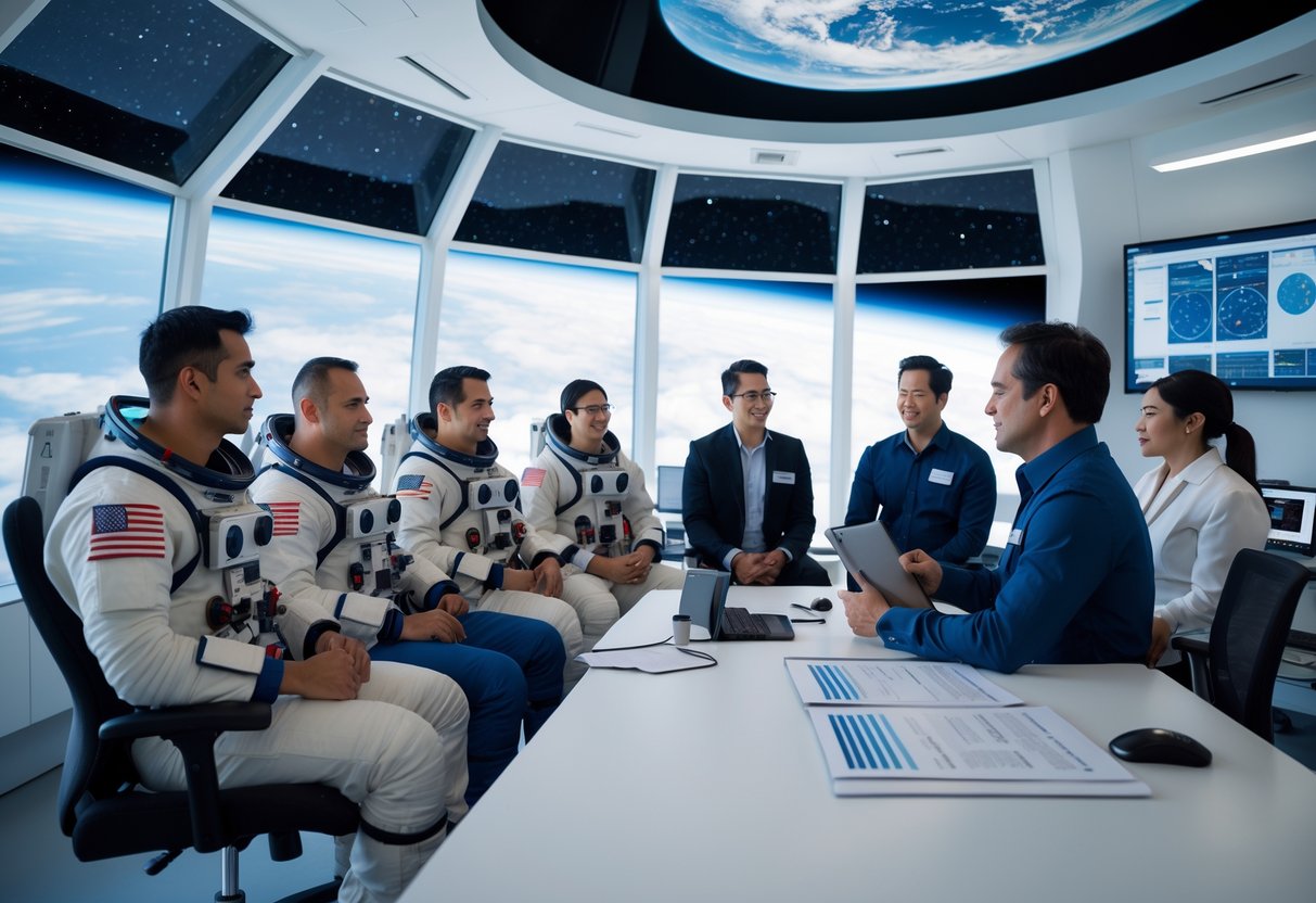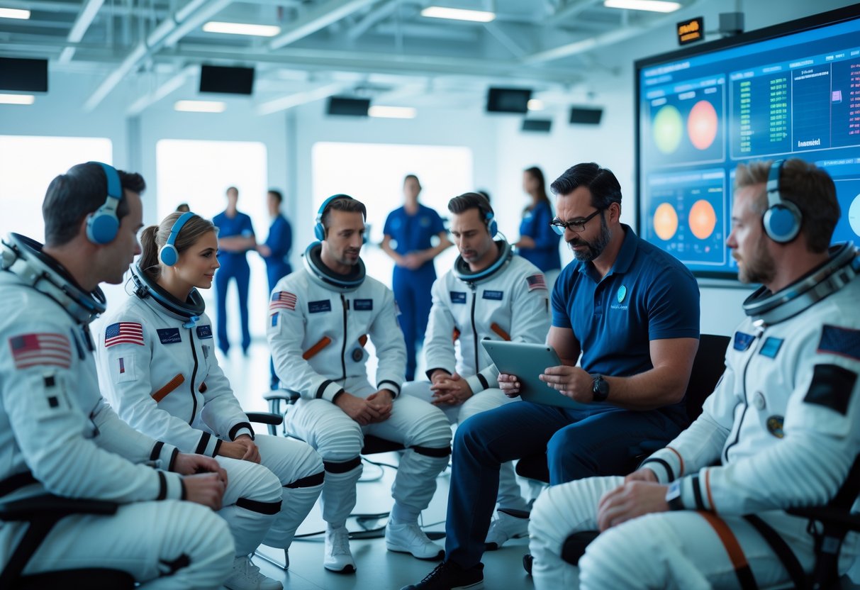 A group of astronauts and psychologists conducting a psychological evaluation in a modern training facility with advanced monitoring equipment.