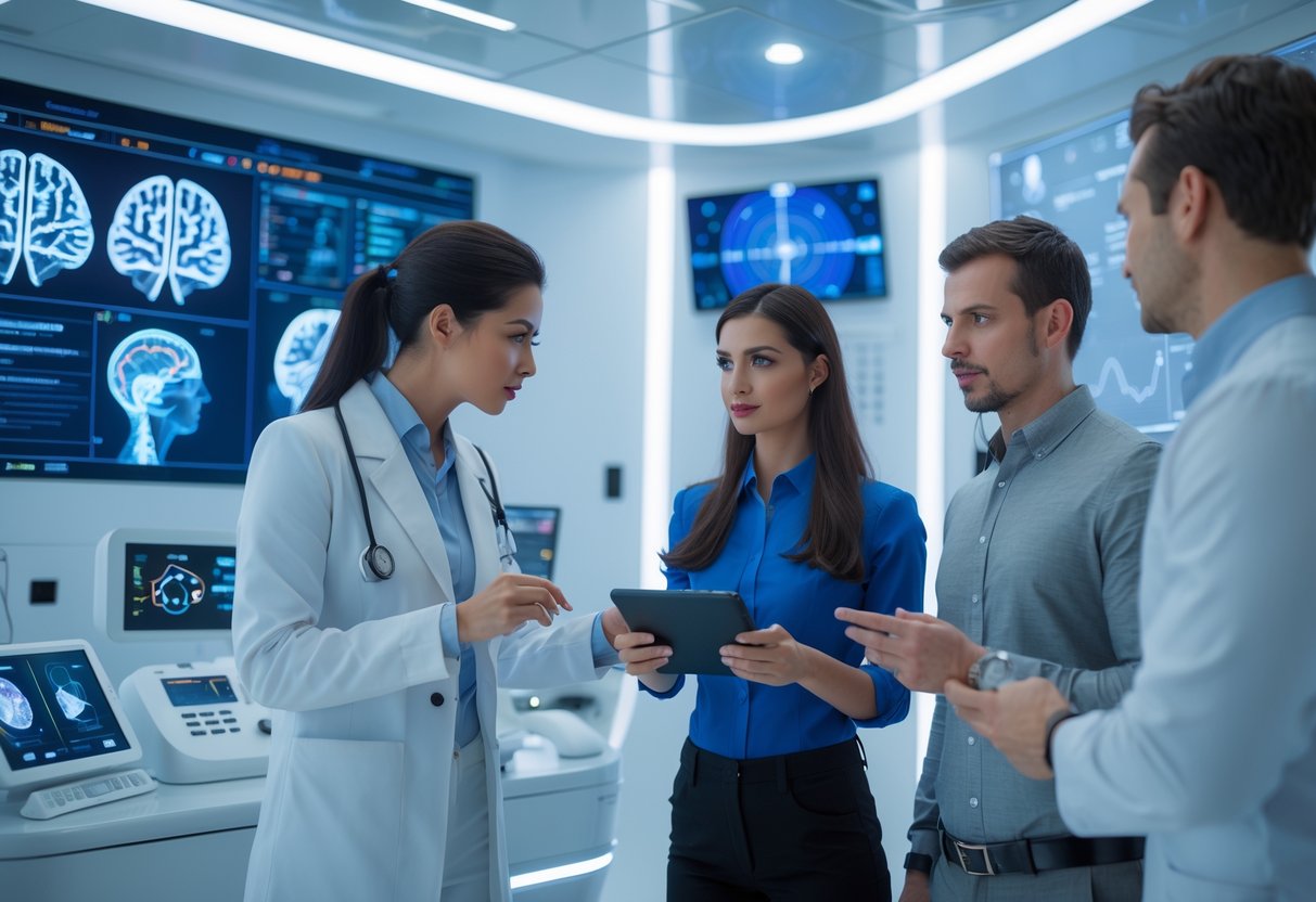 People undergoing psychological evaluations in a high-tech clinic for space tourism screening, with a psychologist interacting with a candidate surrounded by advanced medical equipment.