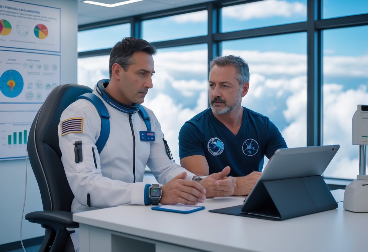 A psychologist evaluating astronauts and space tourists in a bright office with a view of Earth from space.