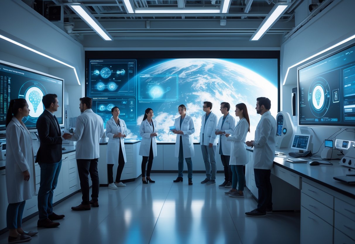 Scientists and psychologists working together in a high-tech lab with holographic displays and a view of Earth from space.
