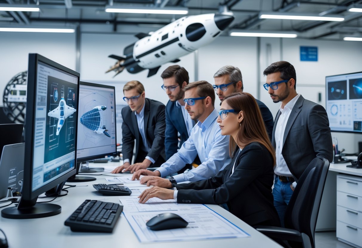 A diverse team of engineers and scientists working together in a modern aerospace office with spacecraft models and technical equipment.