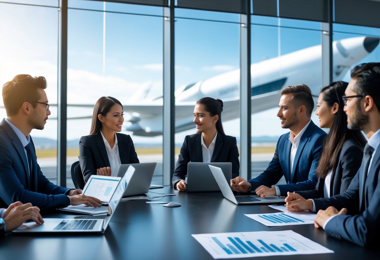 A group of professionals in a meeting room discussing documents with a spaceplane visible outside the window.