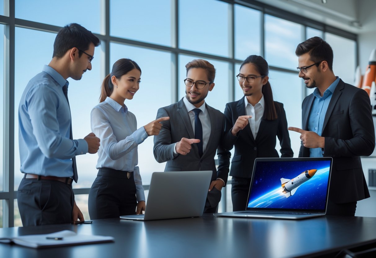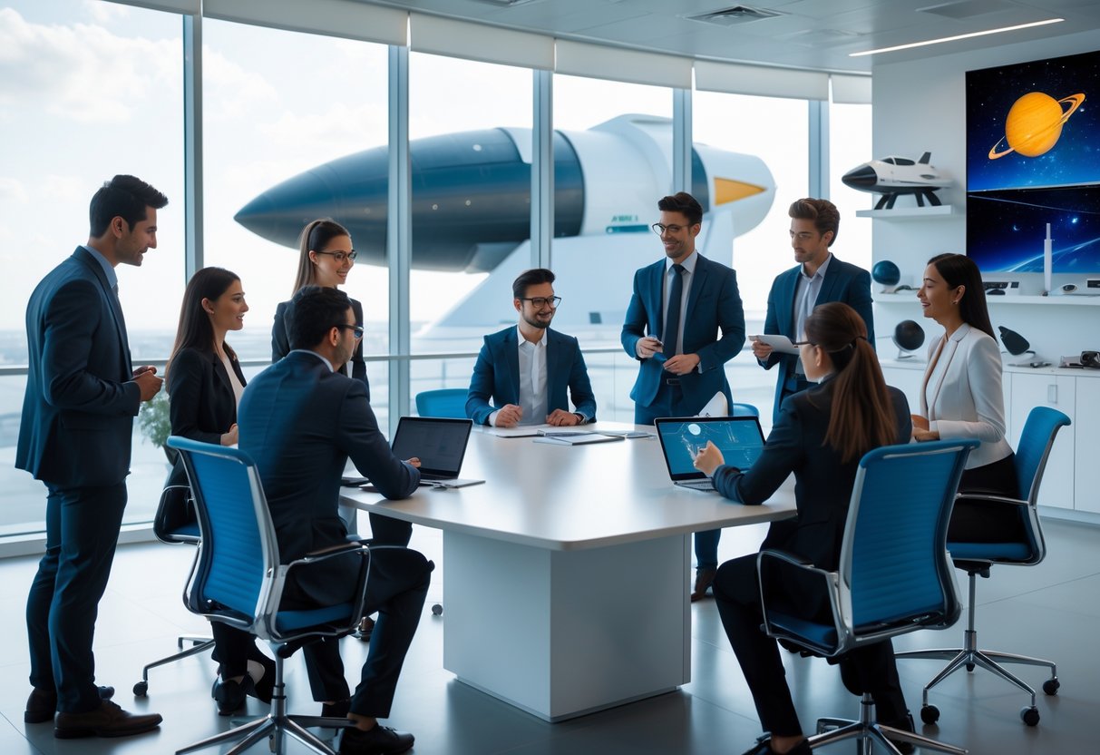 A group of young professionals discussing work around a conference table with a view of a futuristic spaceport and spacecraft outside large windows.